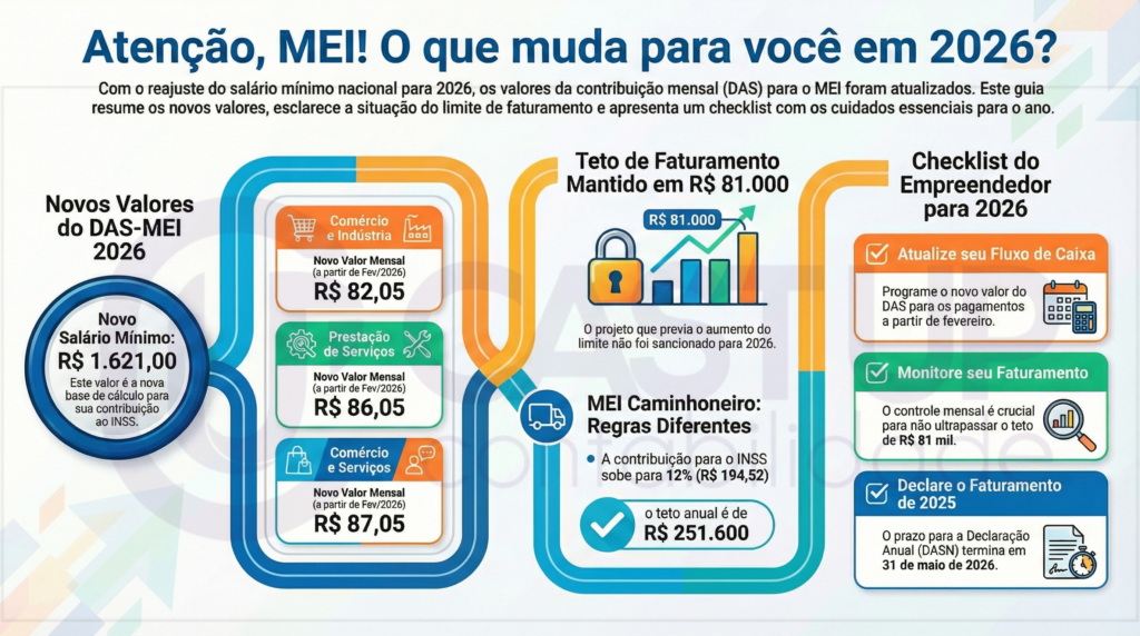 Se você é MEI ou MEI Caminhoneiro, preparamos este guia completo para você entender quanto vai pagar a partir de fevereiro, como ficou a situação do limite de faturamento e quais cuidados tomar para manter seu CNPJ regular.